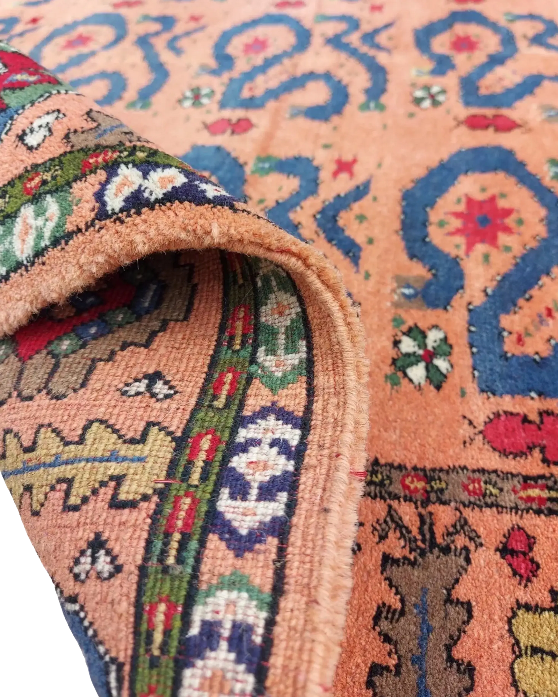 This Persian Rug and Turkoman Rug (125 x 200 cm / 4' x 7') is an authentic hand-knotted wool Oriental carpet crafted for buyers seeking to buy a Persian rug, collect a Turkoman rug, or invest in a luxury handmade Oriental rug for sale. Woven in Turkmenistan from high-quality Saryja wool by skilled Ersari artisans, it features a warm peach palette with dragon-inspired Oriental motifs—an elegant blend of cultural symbolism and timeless design.